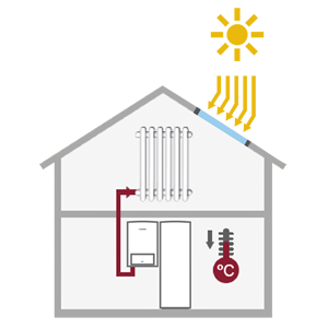O sistema CerapurSolar aproveita a energia do sol para a produção de água quente sanitária e aquecimento. É composto por uma caldeira mural de condensação e por um acumulador solar de inércia de 400 litros. Devido ao acumulador, a energia solar pode ser utilizada para o apoio ao aquecimento e para a produção de água quente sanitária, permitindo uma poupança no consumo de gás até 55% em relação às instalações convencionais, num espaço de apenas 1m² de superfície.